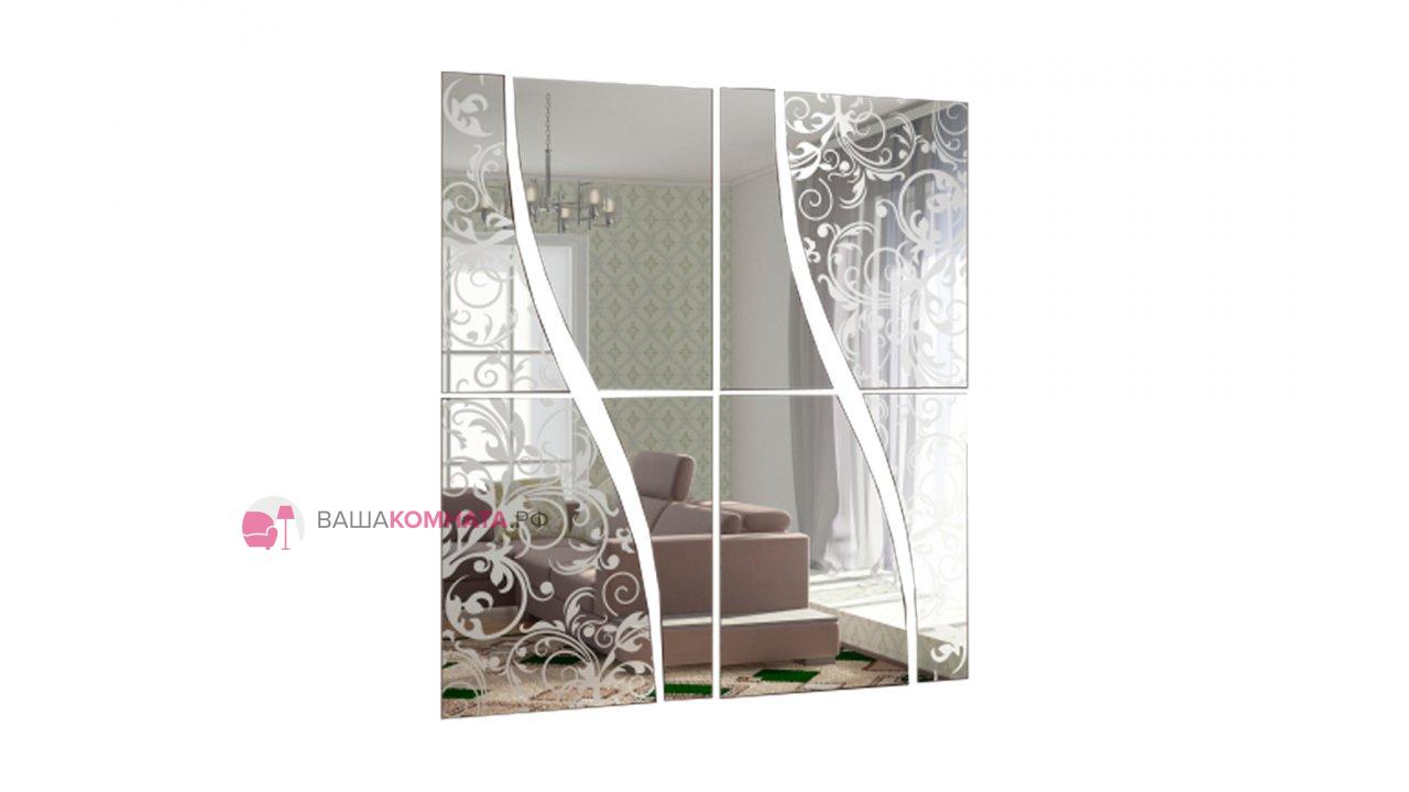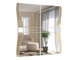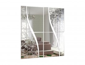 Комплект зеркал "Фантазия" – состоит из двух больших и двух малых фигурных зеркал под серебро и точно таких же зеркал, но с пескоструйным рисунком на зеркальном фоне. Обработка всех сторон – еврокромка.