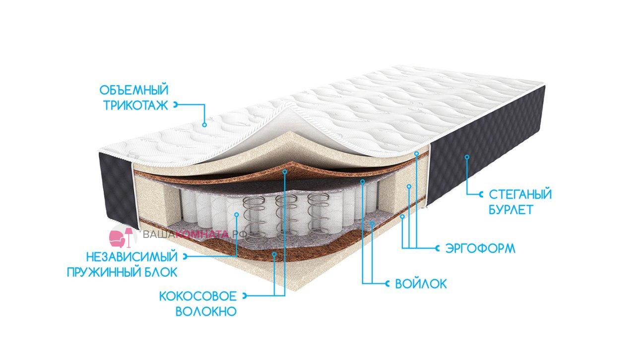 Кокосовая койра наделяет матрас ортопедическими свойствами и обеспечивает поддержку позвоночника спящего в правильном и удобном положении. За комфорт во время сна отвечает эргоформ. Он придает спальному месту мягкости. Эргоформ легко подстраивается под форму тела. При этом уставшие и напряженные мышцы быстро расслабляются. Оба наполнителя хорошо пропускают воздух, не задерживают пыль и влагу. Они отличаются долговечностью и подходят людям, которые страдают аллергией.