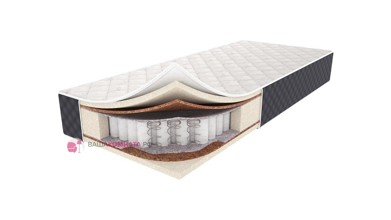 Стороны матраса отличаются жесткостью, изменить которую можно простым переворачиванием изделия. Со стороны средней жесткости проложены слои эргоформа и кокоса. Более жесткая сторона усилена слоем кокосовой койры.
