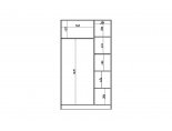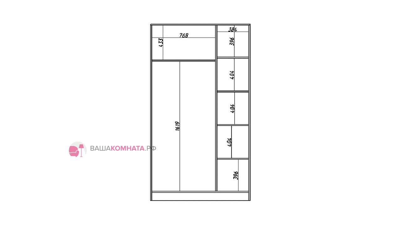 За двумя дверьми находится широкая штанга для вешалок-плечиков с верхней одеждой, деловыми костюмами, красивыми платьями и другой одеждой. Полки, скрытые за боковой дверью, пригодятся для сложенной одежды, постельного и нижнего белья, разнообразных аксессуаров и коробок с обувью.