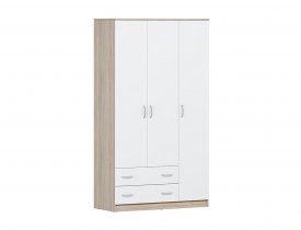 За двумя дверьми находится широкая штанга для вешалок-плечиков с верхней одеждой, деловыми костюмами, красивыми платьями и другой одеждой. Полки, скрытые за боковой дверью, пригодятся для сложенной одежды, постельного и нижнего белья, разнообразных аксессуаров и коробок с обувью.