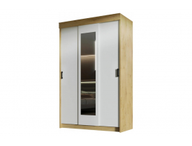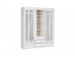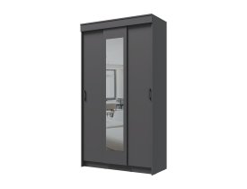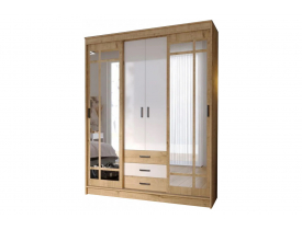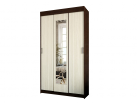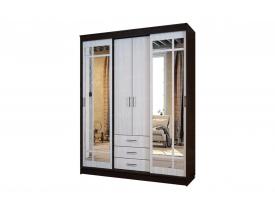Двери с левой и с правой стороны декорированы зеркалами с фацетом. Средняя секция представляет собой закрытый стеллаж с множеством отделений: две распашные двери, за которыми находятся съемные нерегулируемые по высоте полки, внизу три выдвижных ящика на роликовых направляющих. Шкаф-купе выполнен из ЛДСП толщиной 16 мм. Ручки изготовлены из пластика и металла. Пластиковые боковые части затонированы под хром, а центральная часть состоит из матового металла. Задняя стенка и дно выдвижных ящиков - из неокрашенного ДВПО (оргалит). Запил под плинтус у данной модели мебели отсутствует. Шкаф выполнен из качественных материалов, что позволит ему прослужить Вам долгие годы.