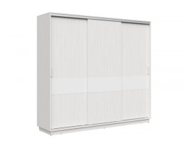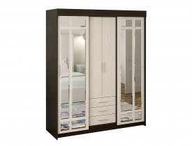 Двери с левой и с правой стороны декорированы зеркалами с фацетом. Средняя секция представляет собой закрытый стеллаж с множеством отделений: две распашные двери, за которыми находятся съемные нерегулируемые по высоте полки, внизу три выдвижных ящика на роликовых направляющих. Шкаф-купе выполнен из ЛДСП толщиной 16 мм. Ручки изготовлены из пластика и металла. Пластиковые боковые части затонированы под хром, а центральная часть состоит из матового металла. Задняя стенка и дно выдвижных ящиков - из неокрашенного ДВПО (оргалит). Запил под плинтус у данной модели мебели отсутствует. Шкаф выполнен из качественных материалов, что позволит ему прослужить Вам долгие годы.