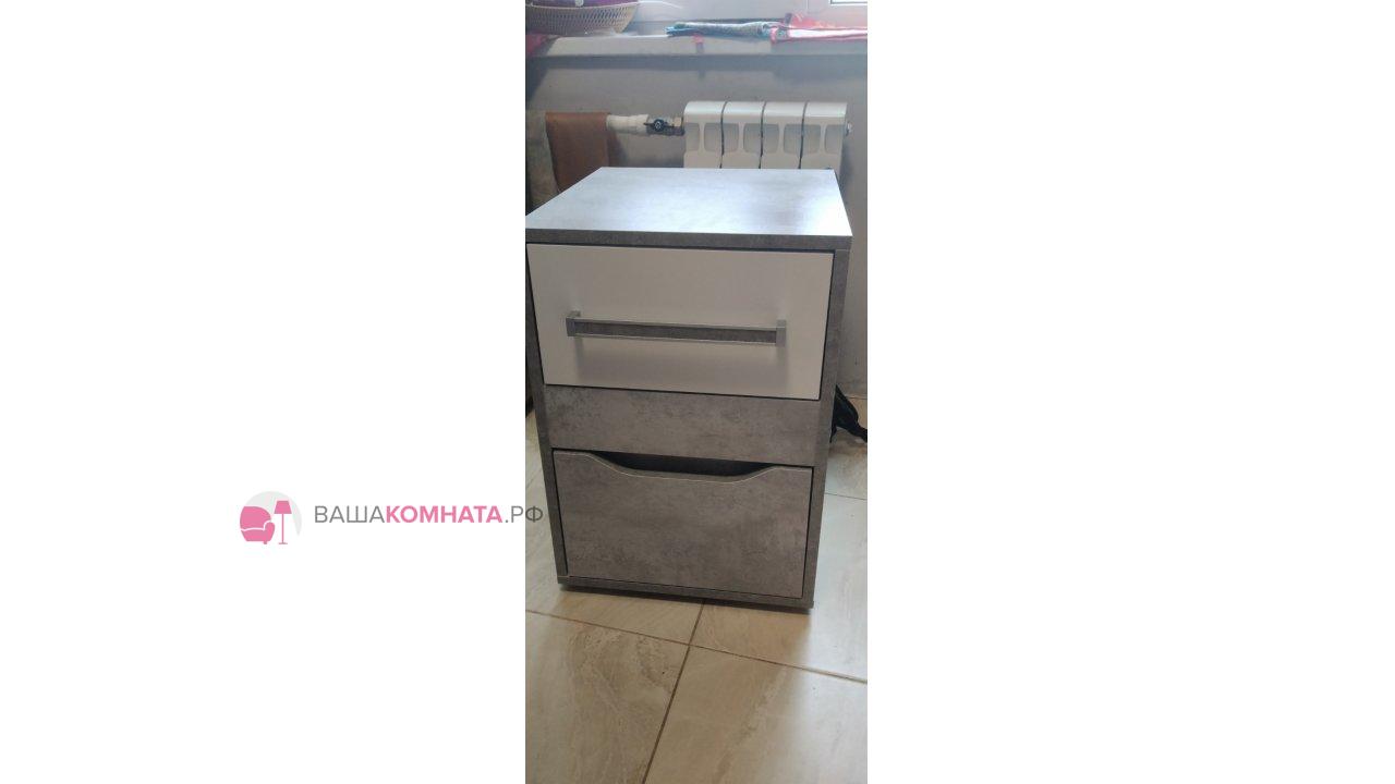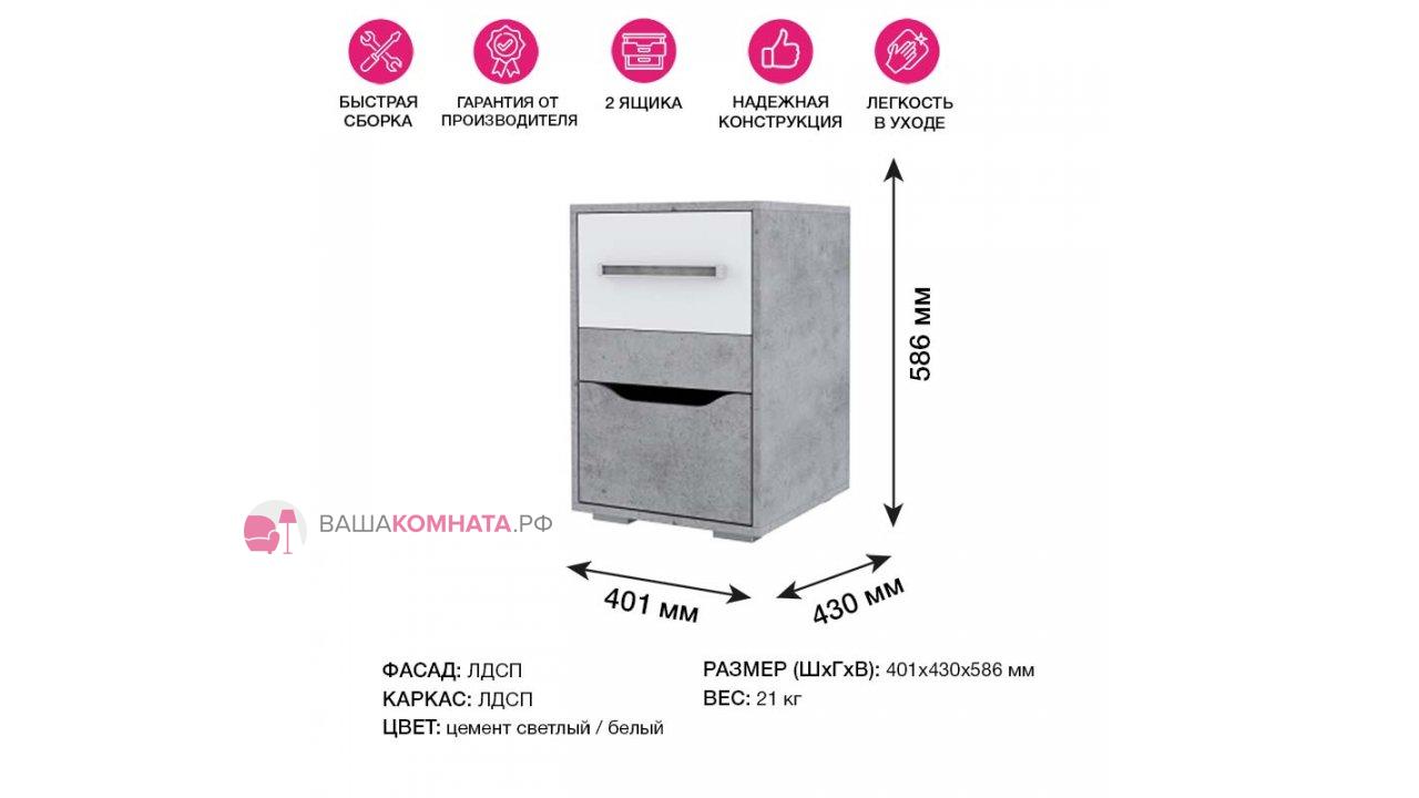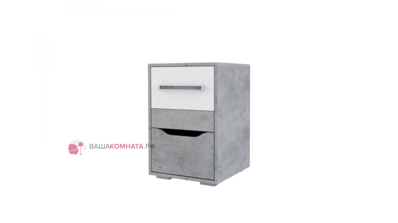 Тумба "Грей" с двумя выдвижными ящиками для хранения вещей. Один ящик с накладкой в цвете «Белый» и ручкой. Второй ящик комплектуется накладкой в цвет корпуса с фрезеровкой вместо ручки. Выдвижные ящики комплектуются телескопическими направляющими полного выдвижения. Открытые торцы всех деталей тумбы облицованы кромкой согласно стандартов, действующих для детской мебели.